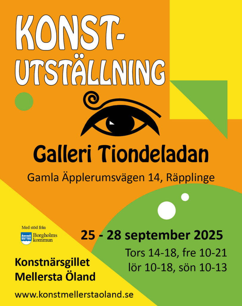 Ölands Skördefest Galleri Tiondeladan, Räpplinge25 – 28 september 2025Deltagande konstnärer:Mirja BetzholtzCarina BillAnita BrobergCharlotta CarlqvistTindra EnglundVeronica Evmark Sandgren (med hänvisning till egen ateljé)Meith FagerqvistHelena FolebyLena Levin Holm (med hänvisning till egen ateljé)Ingela Mellgren OhlssonMonika Nordh Cangemark (med hänvisning till egen ateljé)Christina RoslundJoel SchäferTina Skiöld (med hänvisning till egen ateljé) Jubileumsutställning i Lilla Hallen Himmelsberga 19 - 31 juli 2025 Jubileumsutställning 10 år. 14 medlemmar visar måleri, broderi, glas.Deltagande konstnärer:Mirja Betzholtz, Anita Broberg, Charlotta Carlqvist, Veronica Evmark Sandgren, Helena Foleby, Madeleine Karström, Lena LewinHolm, Birgitta Magusson, Monica Nordh Cangemark, Monica Rosell Larsson, Christina Roslund, Joel Schäfer, Tina Skiöld, Göran Stjärndahl